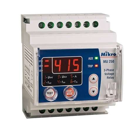 3-phase Voltage Relay, Undervoltage, Overvoltage, Phase Unbalance, Phase loss, Phase sequence, ith or without neutral connection, Phase to phase or phase to neutral monitoring, Delay-on, 2 voltage-free output contacts, Voltage and frequency display, Power supply 3-Phase 380-415 V AC 45-65 Hz, DIN Rail mounting, Size: 85 (H) x 71 (W) x 70 (D) mm