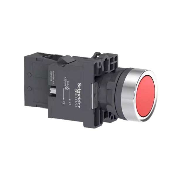 Complete illuminated push button, Easy Harmony XA2, plastic, flush, red, 22mm, spring return, 220V AC, 1NO